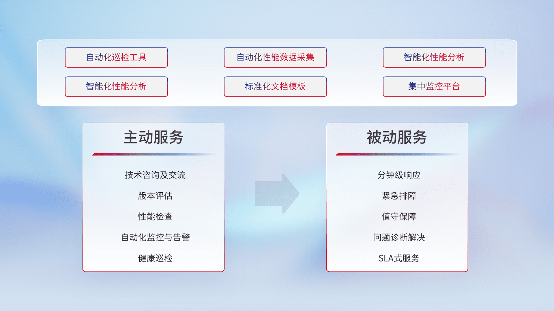 智能化工具和标准化文档,,保障服务质量,,提供主动服务(包含技术咨询、、版本评估、、性能检查、、自动化监控与告警、、、健康巡检)和被动服务包含(分钟级响应、、、紧急排障、、、值守保障、、、、问题诊断解决、、SLA服务)。。